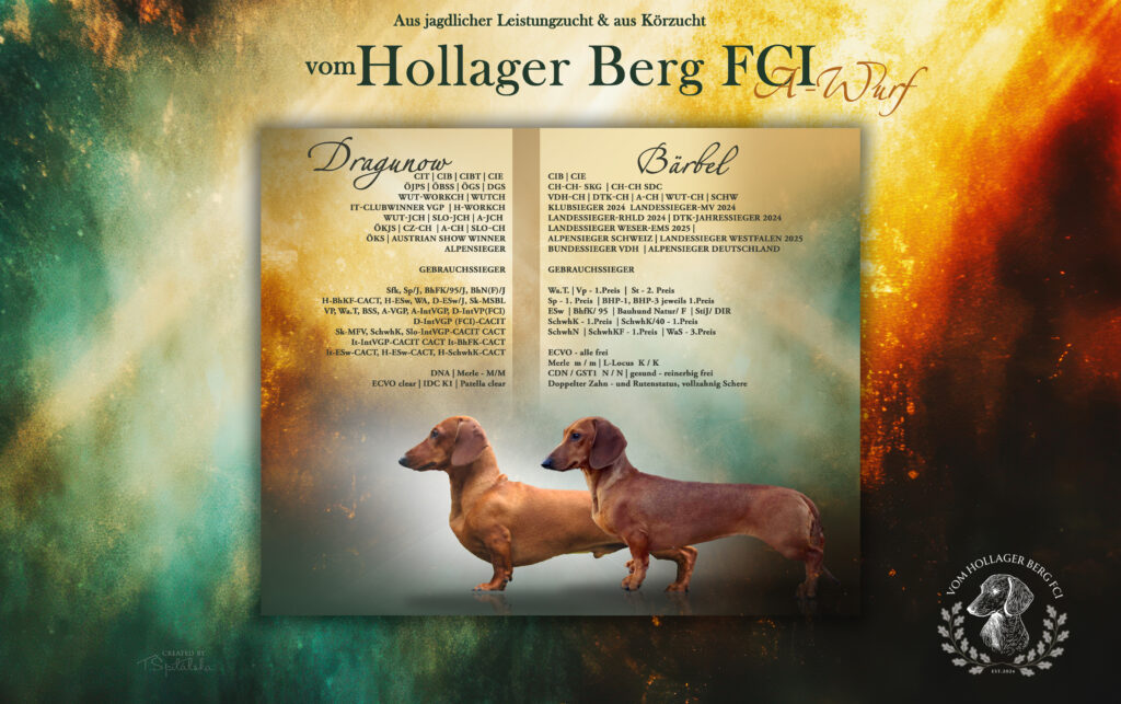 Schweizer Frühjahrsjugendsieger 2022 Ella vom Wörthersee ZZl ÖDHK sg/V, V1, JCAC, JBOB; APoE, Sp, SSP– wohnt in Vorarlberg gemeinsam mit Chili vom Moorgeist und wird im Schweizerischen Jagddackelverein ausgebildet.